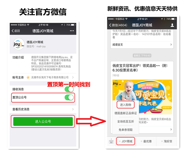 2)关注joy商城官方微信(微信号:mall-joy 或微信号:you6go)并进入微信商城,如下: