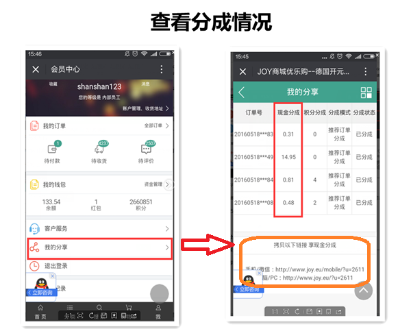 6)系统自动计算分成并发放至您对应的优乐购账号中,在“用户中心”——“我的分享”里可以查看自己得到的分成情况,积累到1000人民币以上可以“提现”。