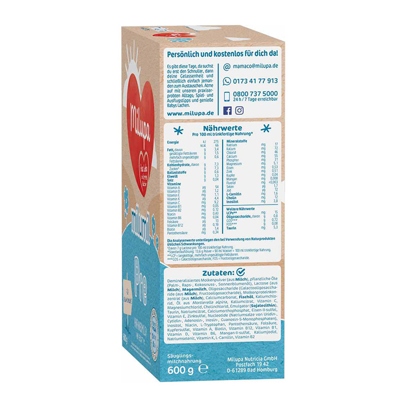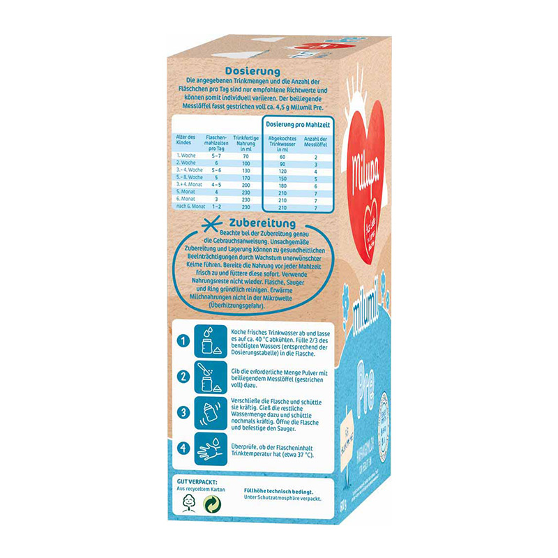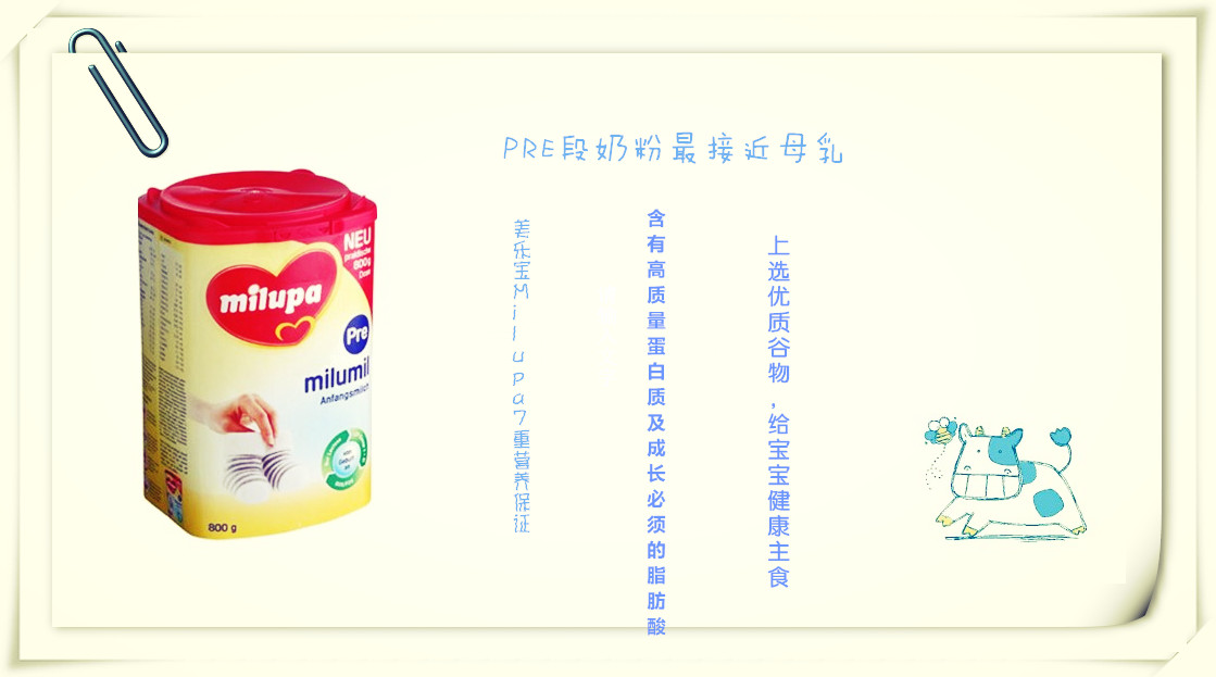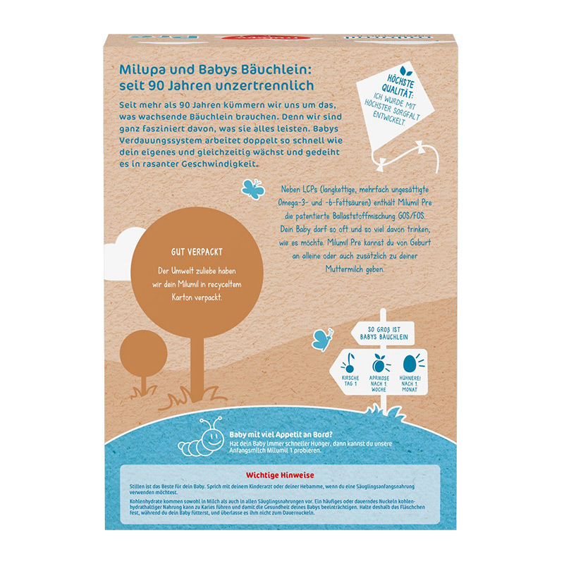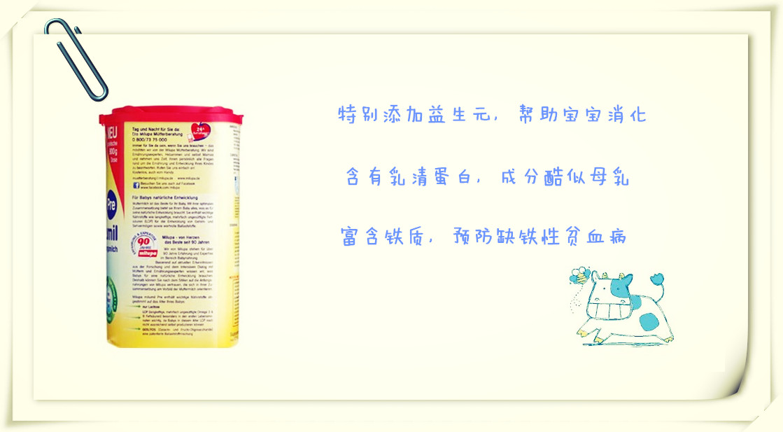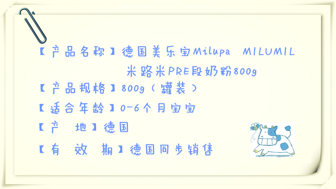 商品名称:德国直邮 德国美乐宝Milupa Milumil婴幼儿配方奶粉 Pre段 800g 适合0-6个月宝宝 商品编号:ECS000054 品牌:美乐宝 上架时间:2014-12-20 商品毛重:1.020千克 保质期:1年 包装规格:罐装 奶粉类别:牛奶 产地:德国 段数:pre 适用年龄:0-6个月 如果您发现商品信息不准确,欢迎纠错;如果您发现有比我们价格更低的,欢迎举报
