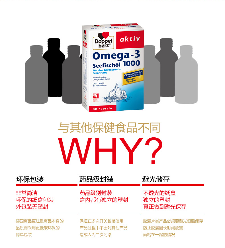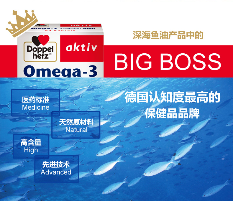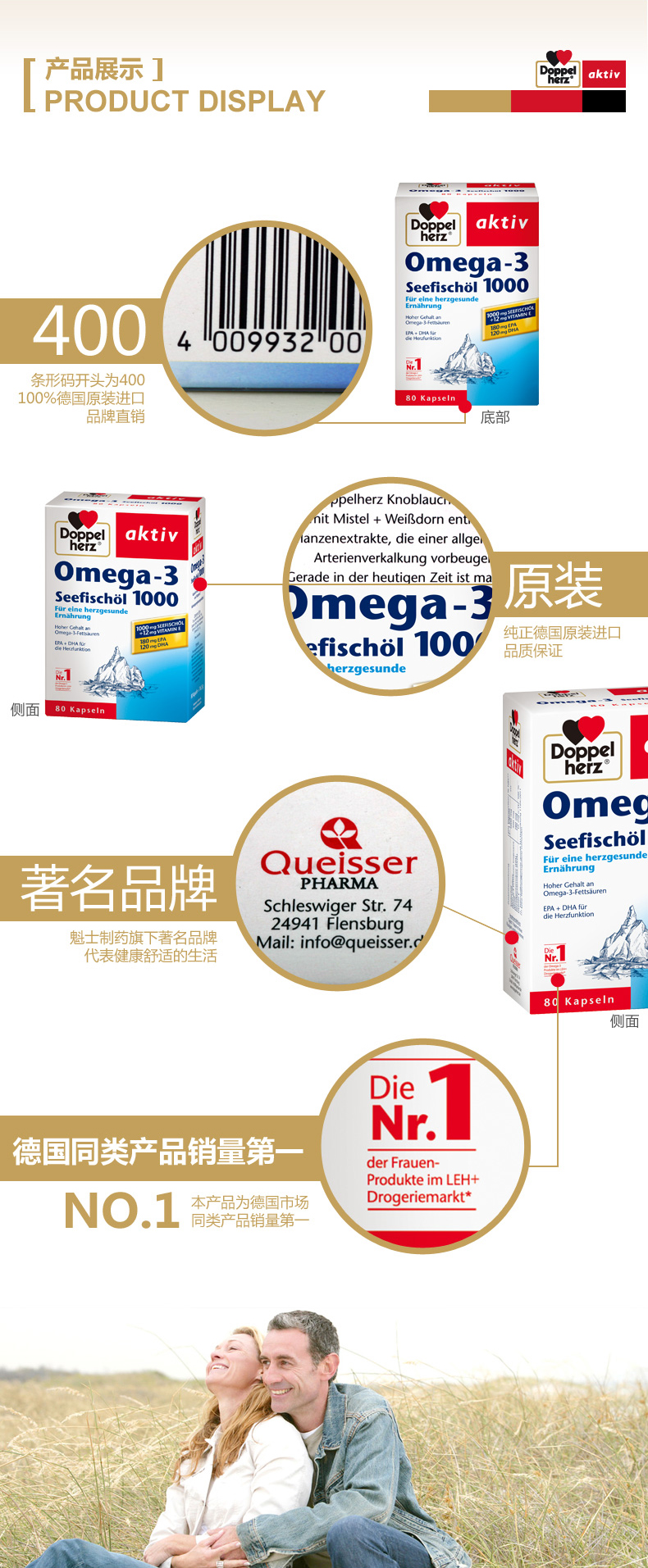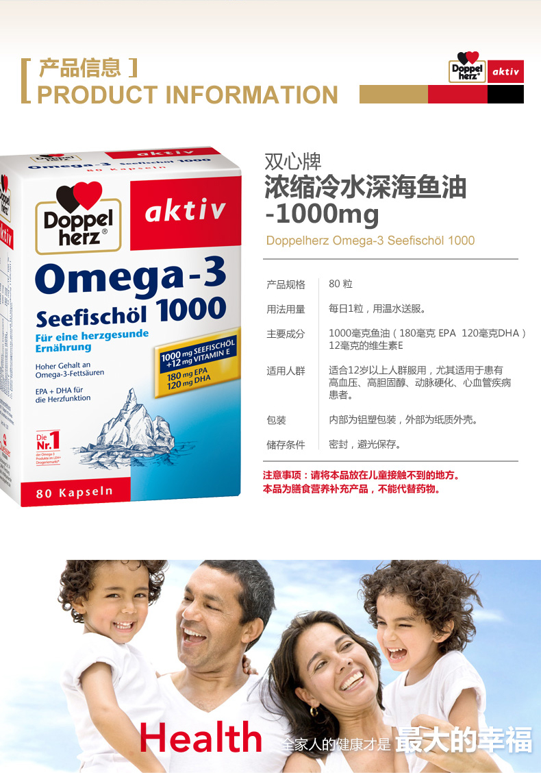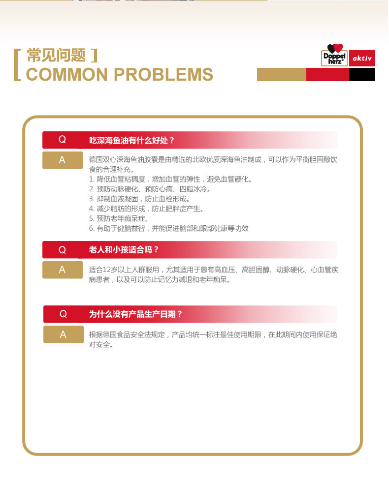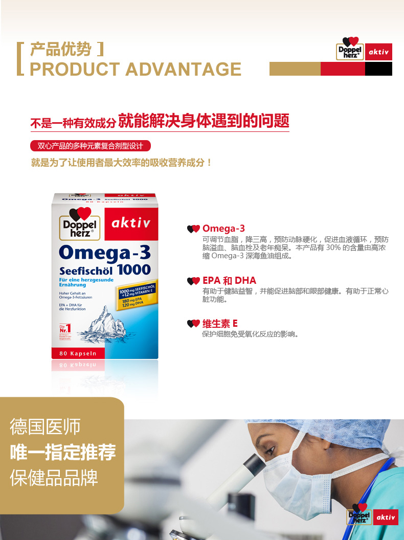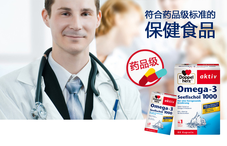 - 商品名称:德国直邮 德国双心牌Doppelherz Omega3 1000深海鱼油 降三高保护心血管 1000mg加量装 80粒装
