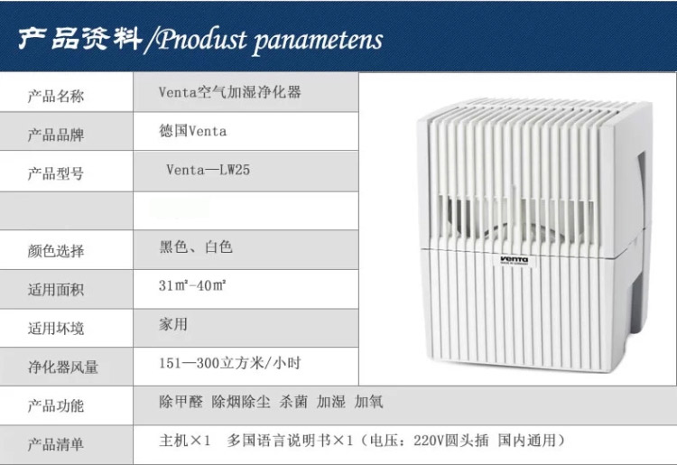 商品名称:德国直邮 德国Venta康特空气净化器家用无耗材加湿氧吧除甲醛烟LW25 白色white 商品编号:LW252 品牌:venta 上架时间:2015-12-11 商品毛重:6.000千克 如果您发现商品信息不准确,欢迎纠错;如果您发现有比我们价格更低的,欢迎举报