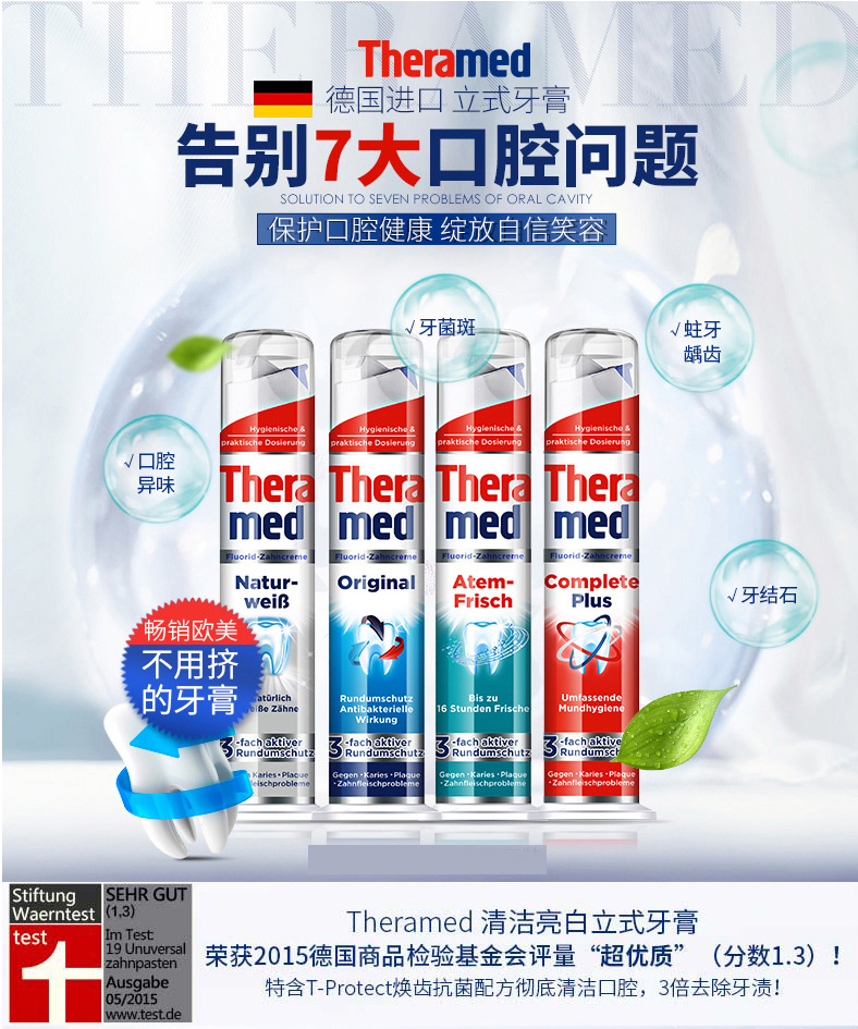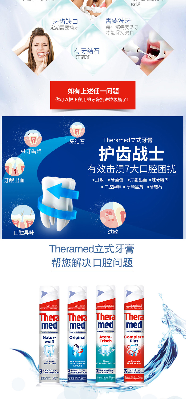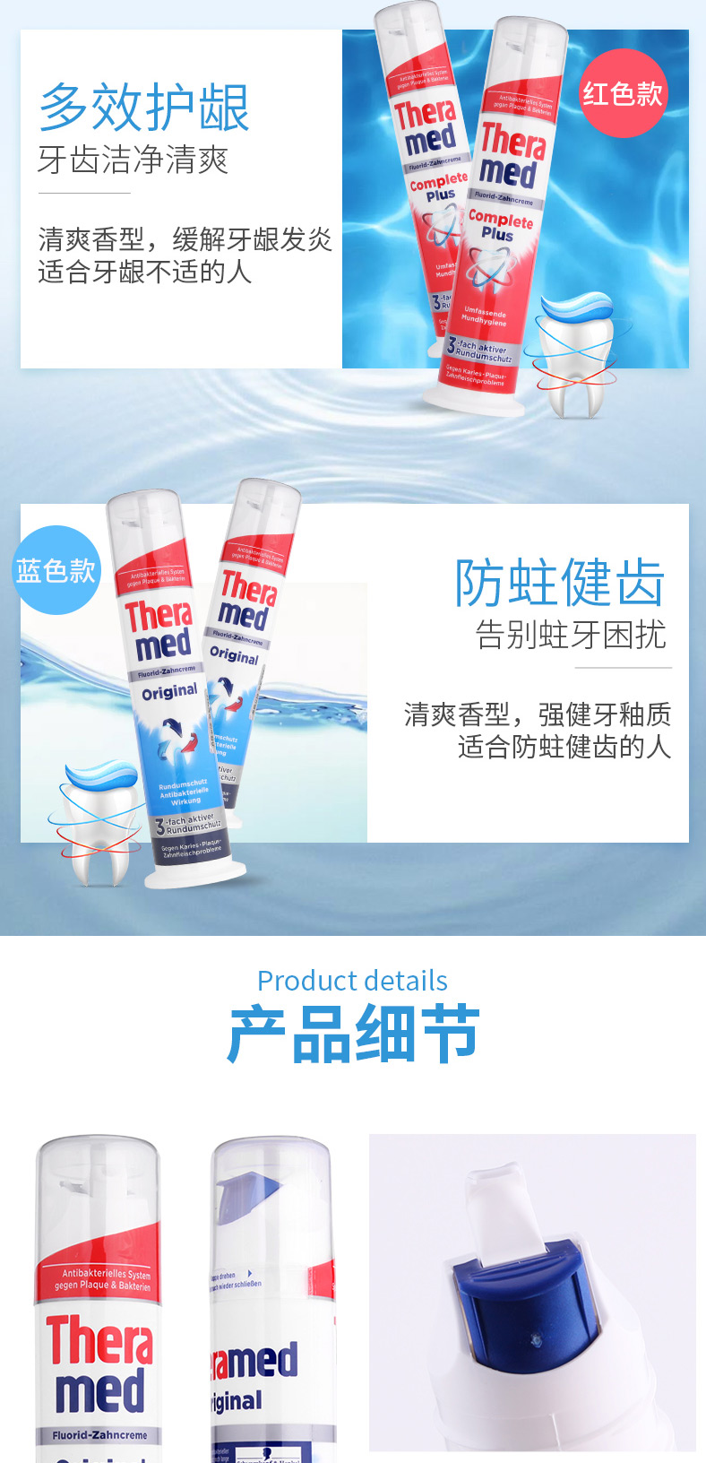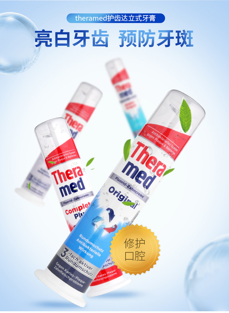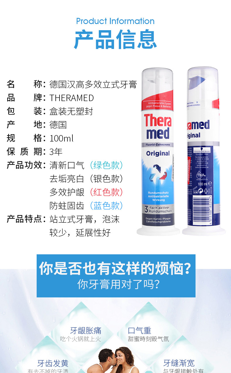 商品名称:德国直邮 德国Theramed泰瑞美汉高施华蔻按压立式牙膏 蓝色防蛀固齿型 100ml 商品编号:1821 品牌:泰瑞美Theramed 上架时间:2016-02-19 商品毛重:272克 如果您发现商品信息不准确,欢迎纠错;如果您发现有比我们价格更低的,欢迎举报