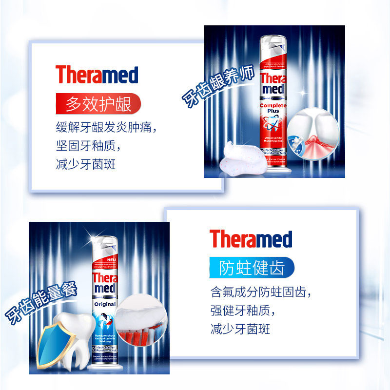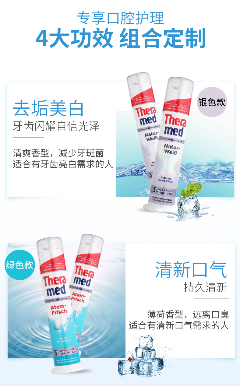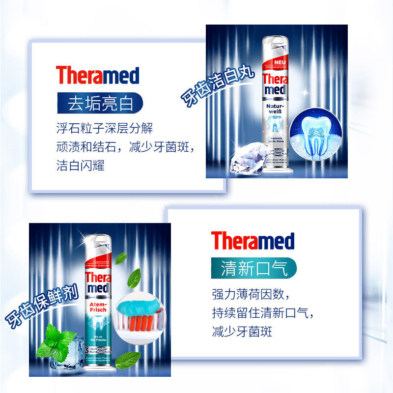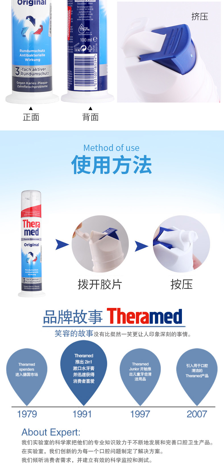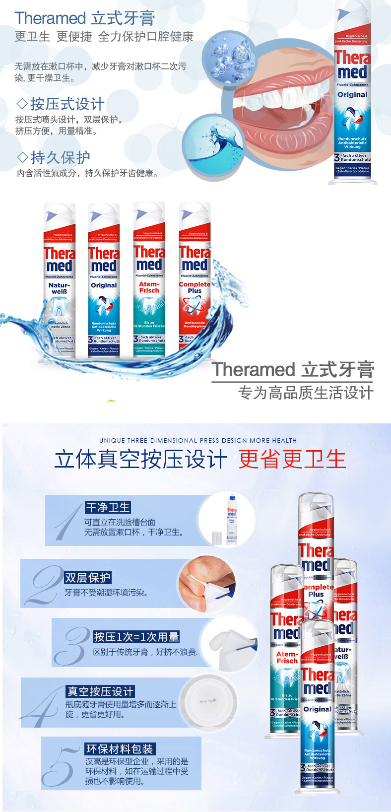 商品名称:德国直邮 德国Theramed泰瑞美汉高施华蔻按压立式牙膏 蓝色防蛀固齿型 100ml 商品编号:1821 品牌:泰瑞美Theramed 上架时间:2016-02-19 商品毛重:272克 如果您发现商品信息不准确,欢迎纠错;如果您发现有比我们价格更低的,欢迎举报