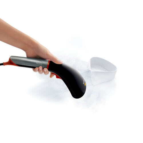 手提式蒸气挂熨机采用人工学精巧设计,舒适轻巧。只需按下蒸气开关,持续蒸气便能快速去除绉褶。