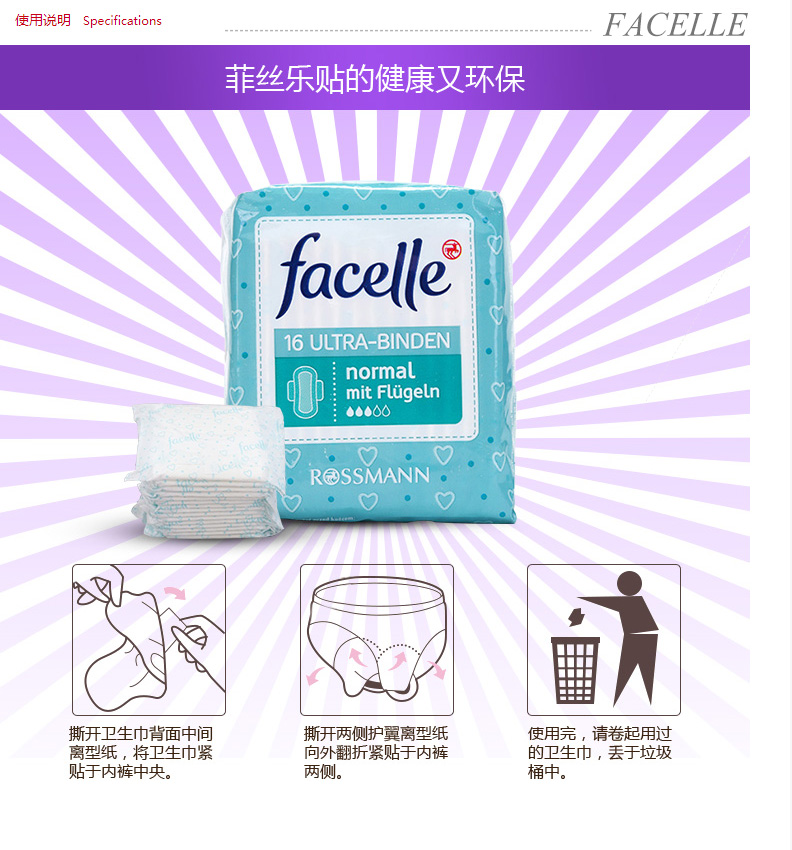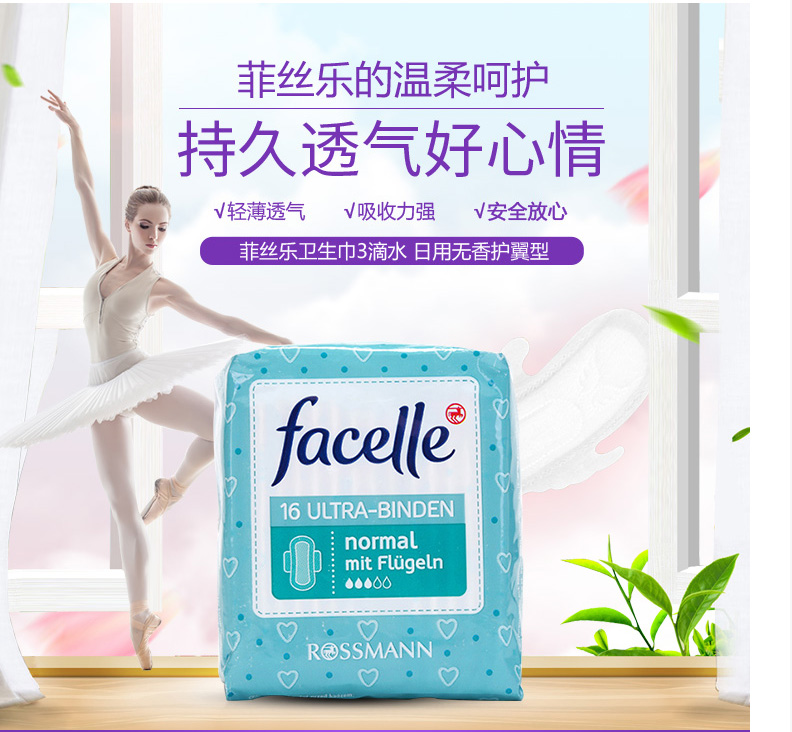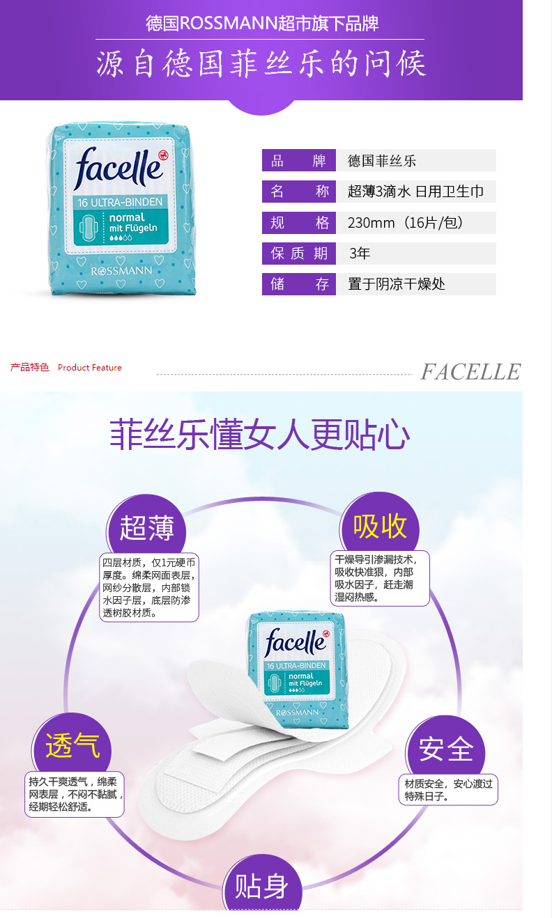 商品名称:德国直邮 德国facelle超薄透气卫生巾 无香无荧光剂 日用3滴水 23cm 16片/包 商品编号:8210 品牌:facelle 上架时间:2015-01-17 商品毛重:86克 如果您发现商品信息不准确,欢迎纠错;如果您发现有比我们价格更低的,欢迎举报