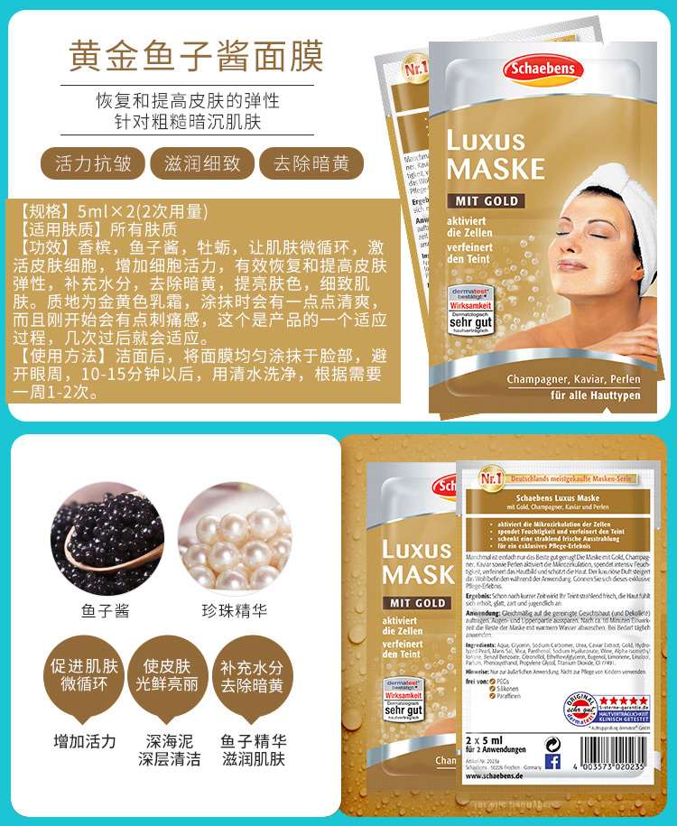 商品名称:保税直发 Schaebens雪本诗黄金豪华全效面膜 2x5ml 商品编号:XH4107 品牌:雪本诗 上架时间:2017-10-26 商品毛重:30克 如果您发现商品信息不准确,欢迎纠错;如果您发现有比我们价格更低的,欢迎举报