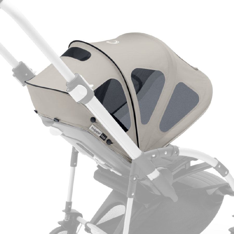 bugaboo bee3通风遮阳篷介绍炎热的天气里,多功能Bugaboo bee3通风遮阳蓬在为孩子提供全身遮阳保护的同时也提供了额外的透气性。通风遮阳篷采用结实耐用的防水防油污面料,提供UPF50+的防晒保护(不含网眼布),精细的网眼布可使微风自由进入。拉开透明口袋窗拉链,使空气流通效果更好。调节遮阳篷位置确保为宝宝提供全天的遮阳保护。需要更多庇荫?内置弹出式遮阳罩可提供额外的清凉呵护。