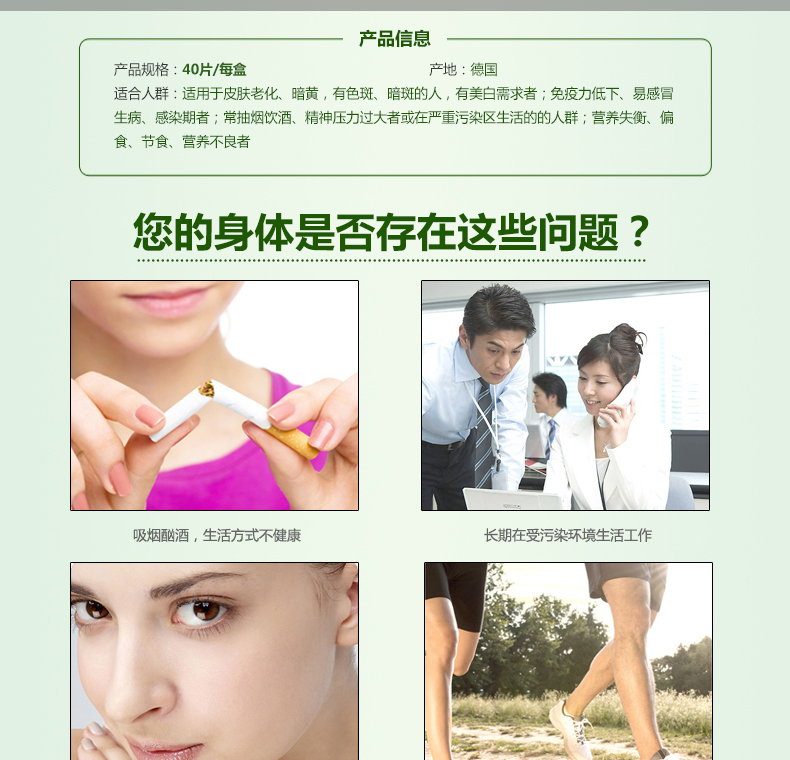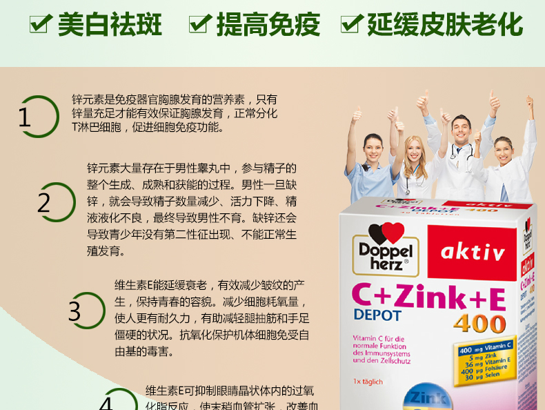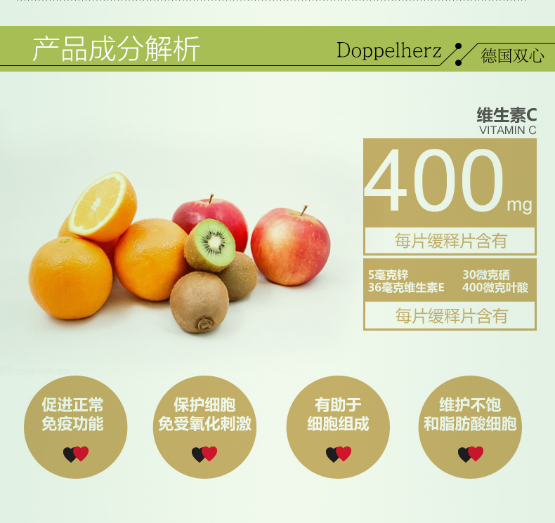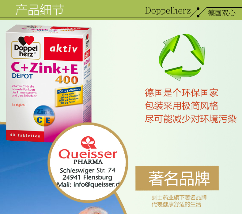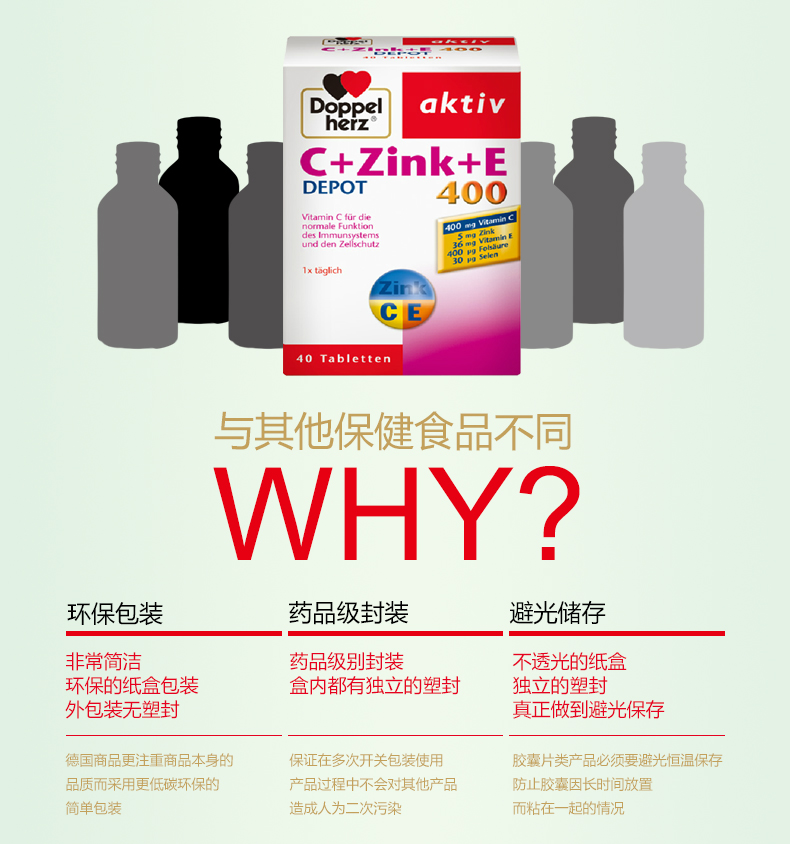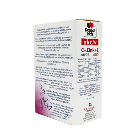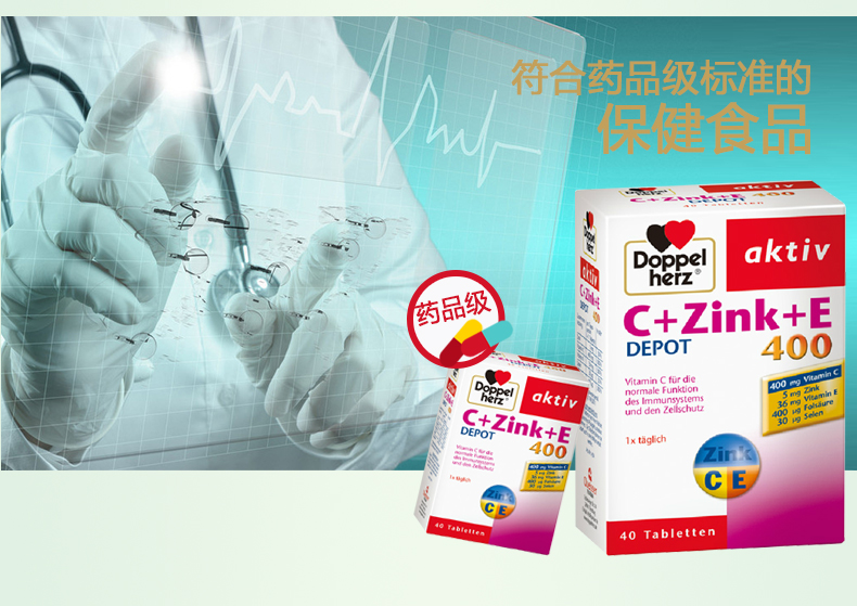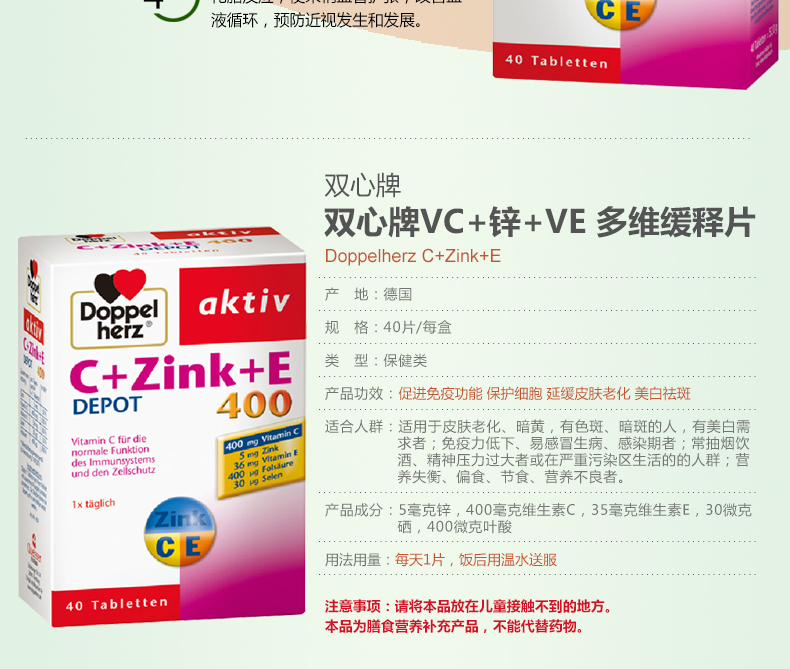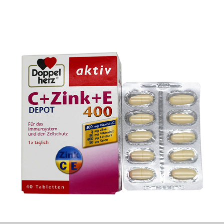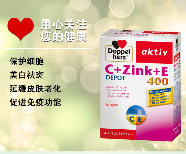 - 商品名称:德国直邮 德国双心牌Doppelherz维生素C+E+锌缓释片 消除黑色素美白保湿抗氧化延缓衰老 40粒装