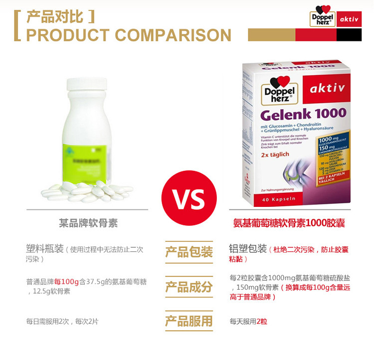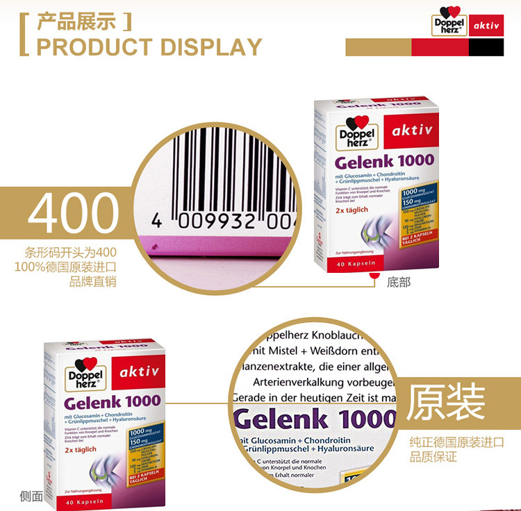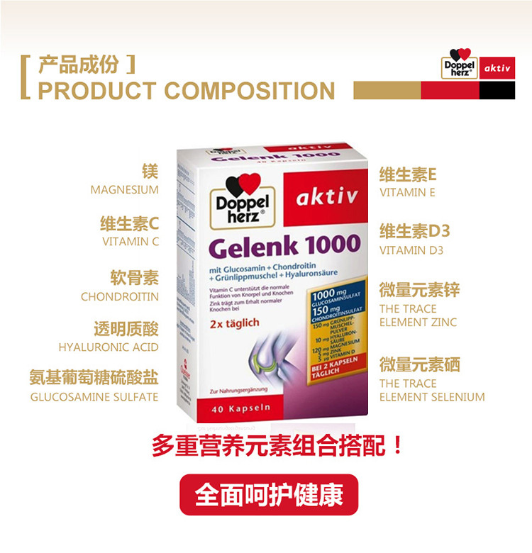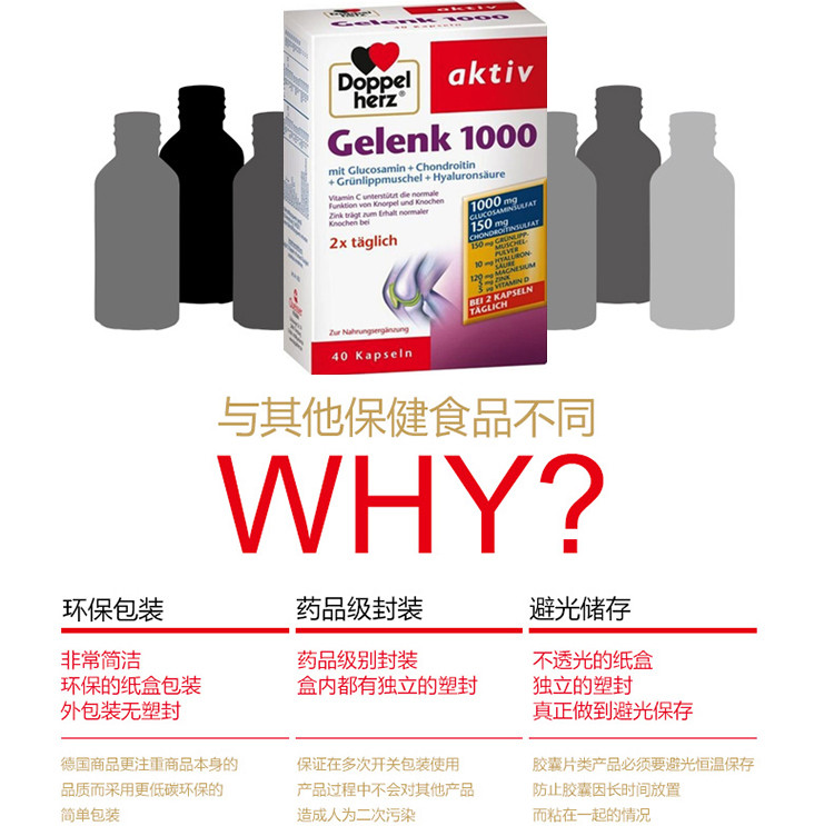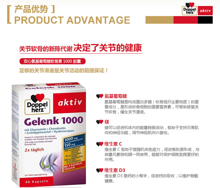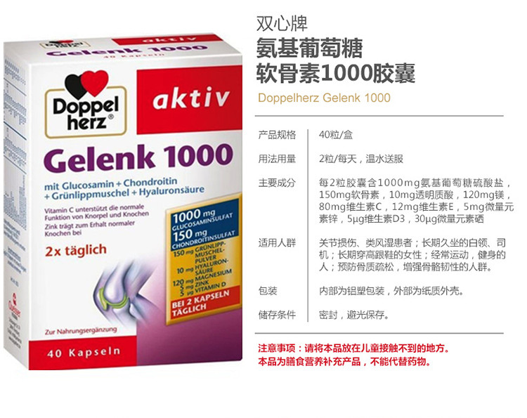 - 商品名称:德国直邮 德国双心牌Doppelherz Gelenk软骨素1000胶囊 预防骨质疏松缓解关节肿胀疼痛 40粒装
