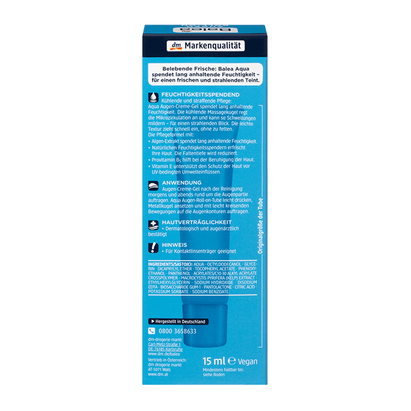 商品名称:【清仓,清完通知】保税直发 Balea AQUA芭乐雅蓝藻精华补水保湿滚珠眼霜15ml 商品编号:XH4069 品牌:Balea芭乐雅 上架时间:2018-02-23 商品毛重:20克 如果您发现商品信息不准确,欢迎纠错;如果您发现有比我们价格更低的,欢迎举报