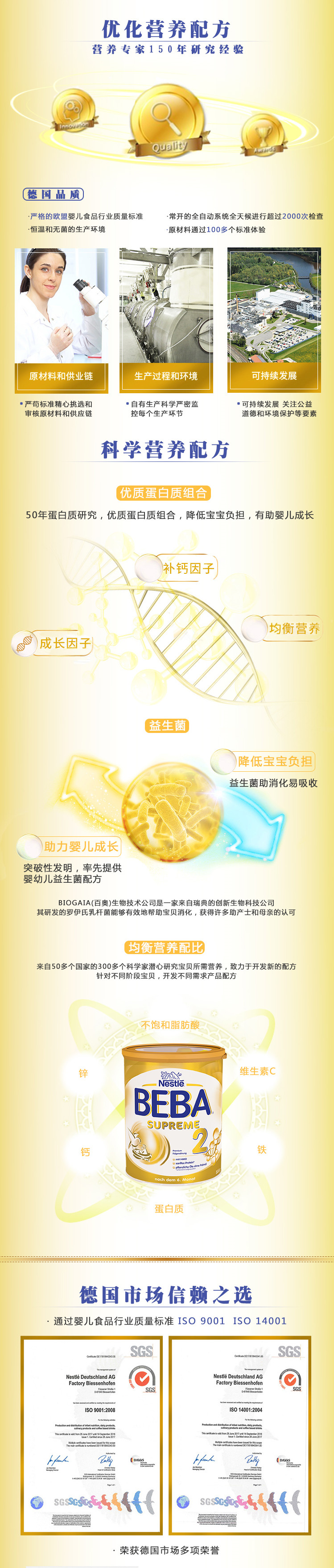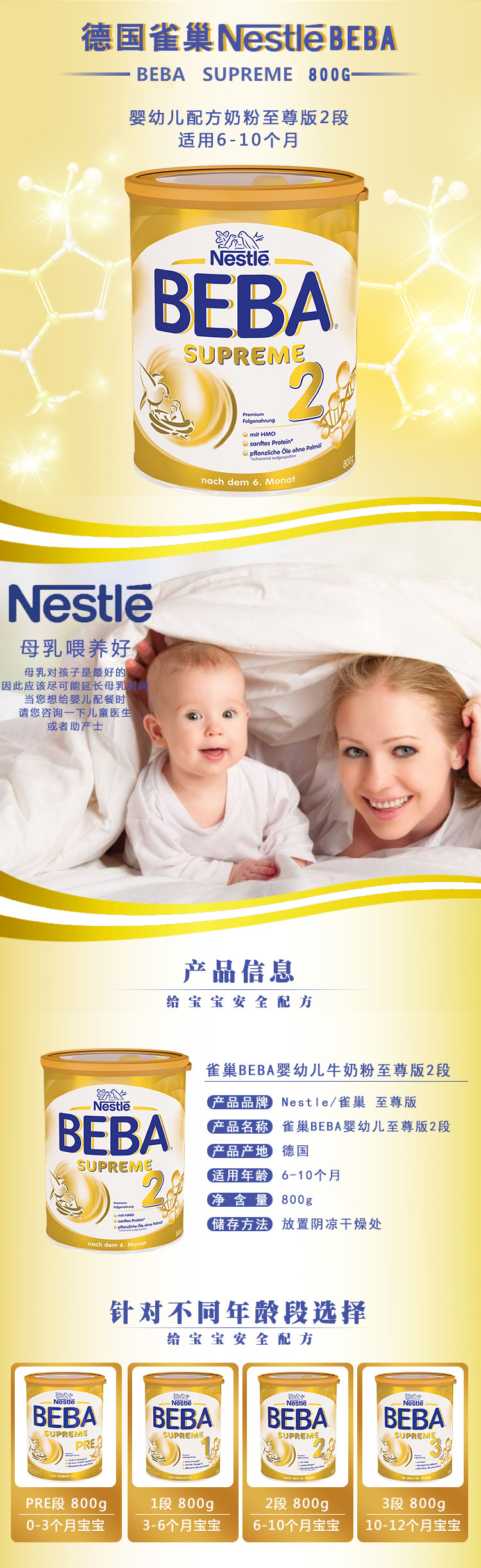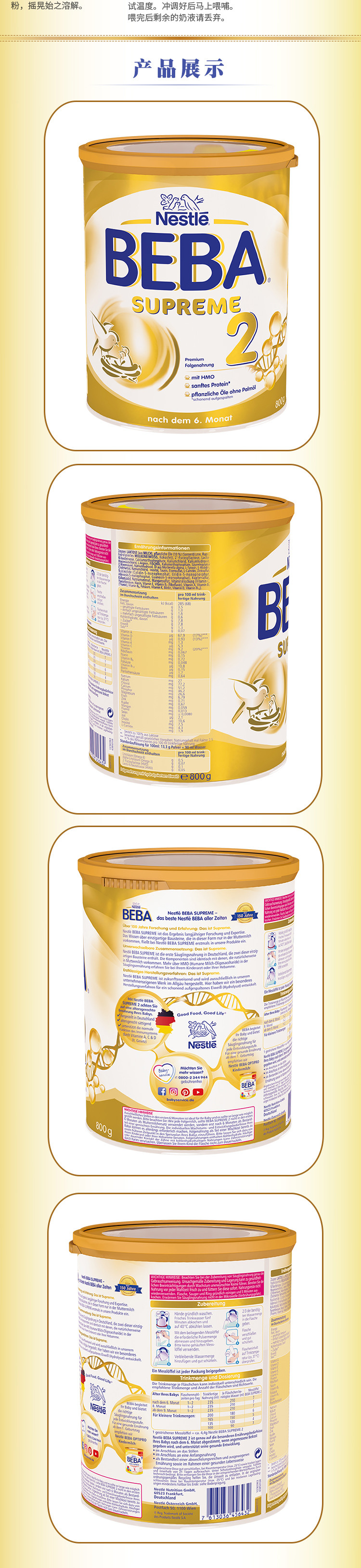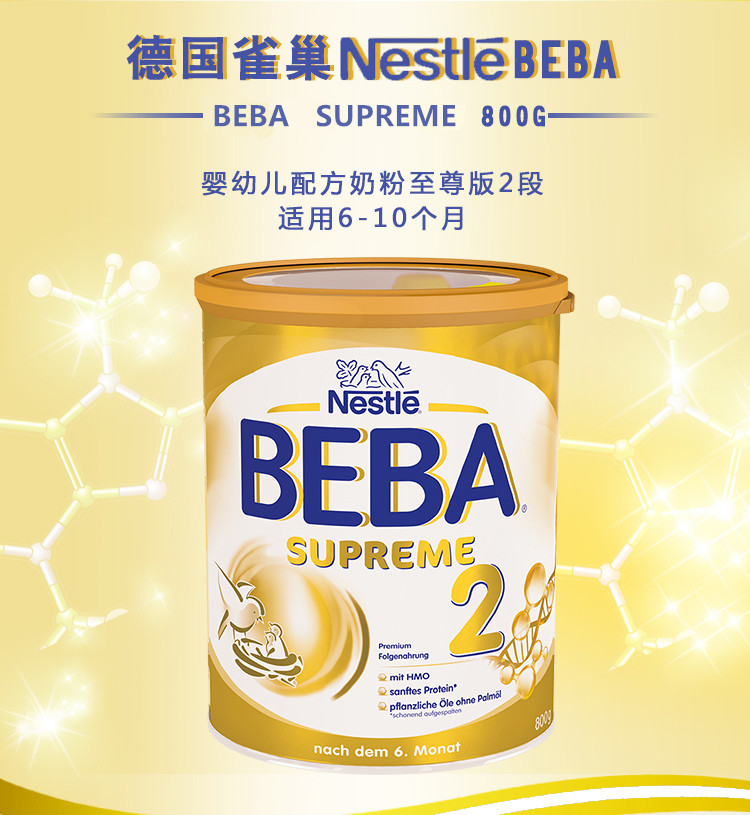 商品名称:德国直邮 雀巢Nestle BEBA婴幼儿奶粉至尊版 2段 适用6-10个月 商品编号:YGO005714 品牌:雀巢 上架时间:2018-09-25 商品毛重:1.030千克 如果您发现商品信息不准确,欢迎纠错;如果您发现有比我们价格更低的,欢迎举报