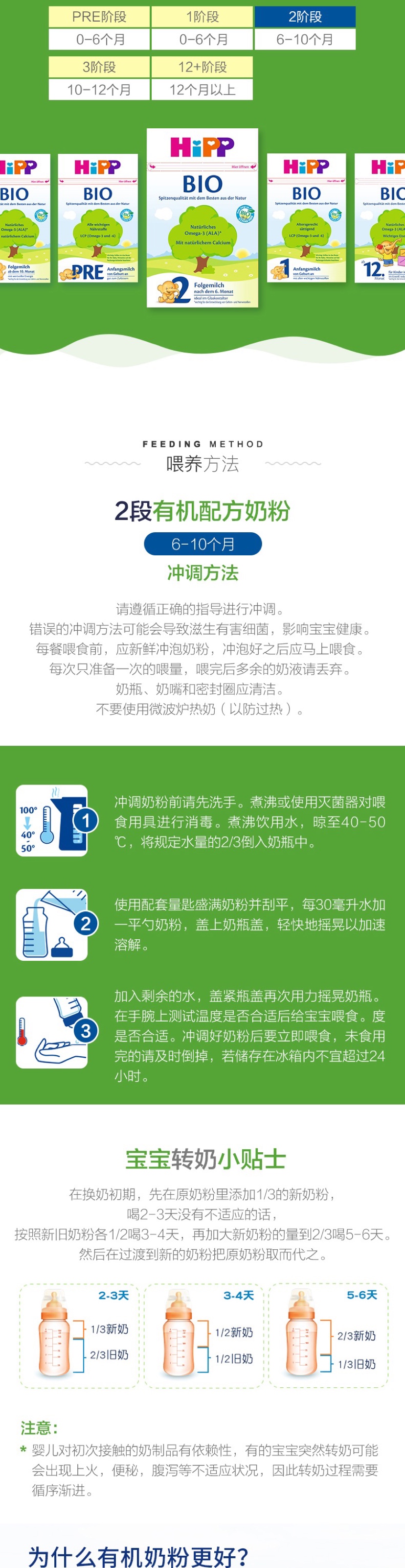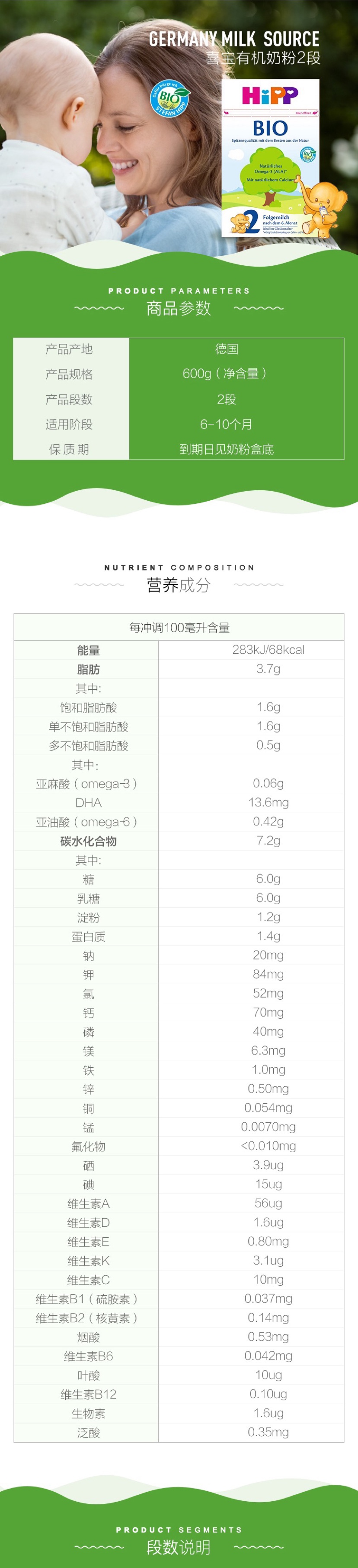 商品名称:德国直邮 德国喜宝Hipp BIO 2有机婴幼儿奶粉 2段 600g 适合6-10个月宝宝 商品编号:HIB2 品牌:喜宝HIPP 上架时间:2015-07-06 商品毛重:700克 保质期:12个月 包装规格:800g 奶粉类别:牛奶粉 原箱规格:6盒 段数:2段 产地:德国 适用年龄:6-10个月 如果您发现商品信息不准确,欢迎纠错;如果您发现有比我们价格更低的,欢迎举报