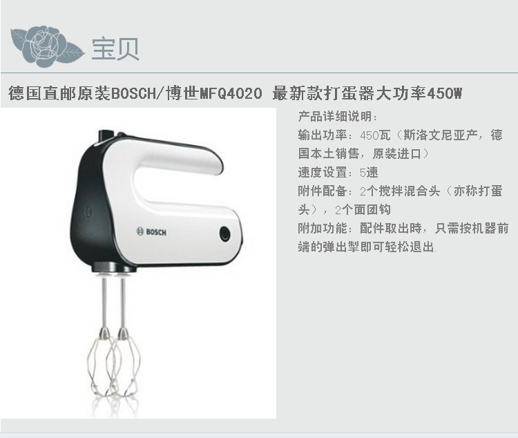商品名称:德国直邮 Bosch博世手持式电动打蛋器搅拌机 MFQ4020 商品编号:YGO000694 品牌:博世BOSCH 上架时间:2015-07-06 商品毛重:1.200千克 如果您发现商品信息不准确,欢迎纠错;如果您发现有比我们价格更低的,欢迎举报