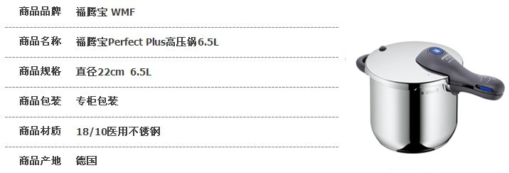 商品名称:德国直邮 德国福腾宝WMF高压锅压力锅PERFECT PLUS 6.5L 0793139990 商品编号:YGO000739 品牌:WMF福腾宝 上架时间:2015-07-09 商品毛重:4.500千克 如果您发现商品信息不准确,欢迎纠错;如果您发现有比我们价格更低的,欢迎举报
