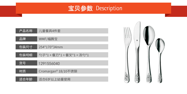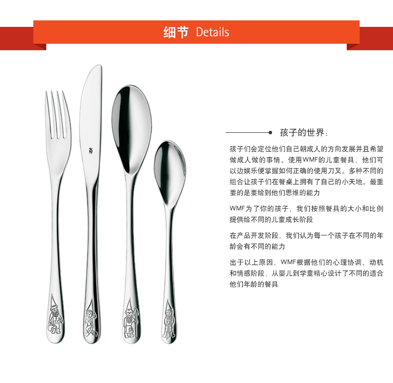 商品名称:德国直邮 德国WMF Zwerge福腾宝儿童西餐餐具套装 1291556040 商品编号:YGO000754 品牌:WMF福腾宝 上架时间:2015-07-10 商品毛重:260克 如果您发现商品信息不准确,欢迎纠错;如果您发现有比我们价格更低的,欢迎举报