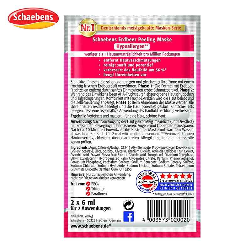 商品名称:德国直邮 德国Schaebens Erdbeer Peeling Maske面膜世家雪本诗草莓清洁面膜 2x6ml 商品编号:4109 品牌:雪本诗 上架时间:2015-08-25 商品毛重:30克 如果您发现商品信息不准确,欢迎纠错;如果您发现有比我们价格更低的,欢迎举报
