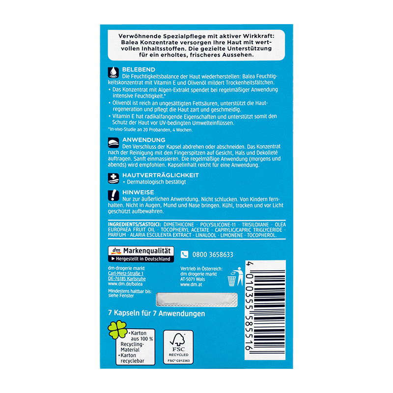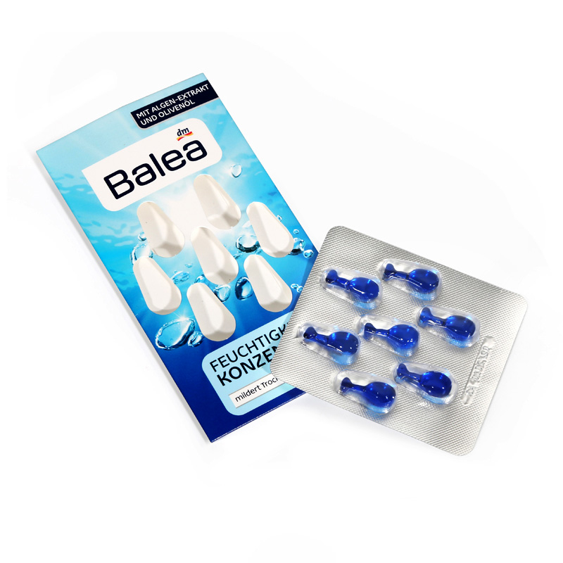 【德文名称】Balea Feuchtigkeits Konzentrat【产品产地】德国【适合肤质】所有缺水的肌肤【产品规格】7粒【包装说明】纸板封塑【产品说明】绿藻是地球上最早的生命之一。绿藻除含有丰富的蛋白质、维生素、微量元素、多种氨基酸等营养成份外,更特别的是含有自然界中唯一的基因生物活性物质C.G.F(绿藻细胞生长促进因子)而备受各国生化学家和营养学家的推崇。绿藻中的核酸、CGF 及抗氧化剂,可以使皮肤完美无瑕,减少皱纹和老人斑问题。适合各种肤质,防止肌肤水分流失,调节肌肤水平衡,帮助肌肤防御外界环境的侵害,使护理后的肌肤柔韧有弹性,无紧绷感觉。【使用说明】洁面后,旋转拧断或剪断胶囊颈部,用手指蘸取精华液,均匀涂抹于面部肌肤,用指尖轻轻按摩使其充分吸收。建议一粒一次用完,充份按摩让皮肤完全吸收,连用7天为一有效护肤疗程
